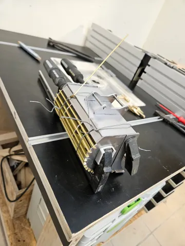 Anschließend wurden alle Teile mit Schraubzwingen und Draht in Position gebracht, was aufgrund der vielen Stangen eine echte Herausforderung war